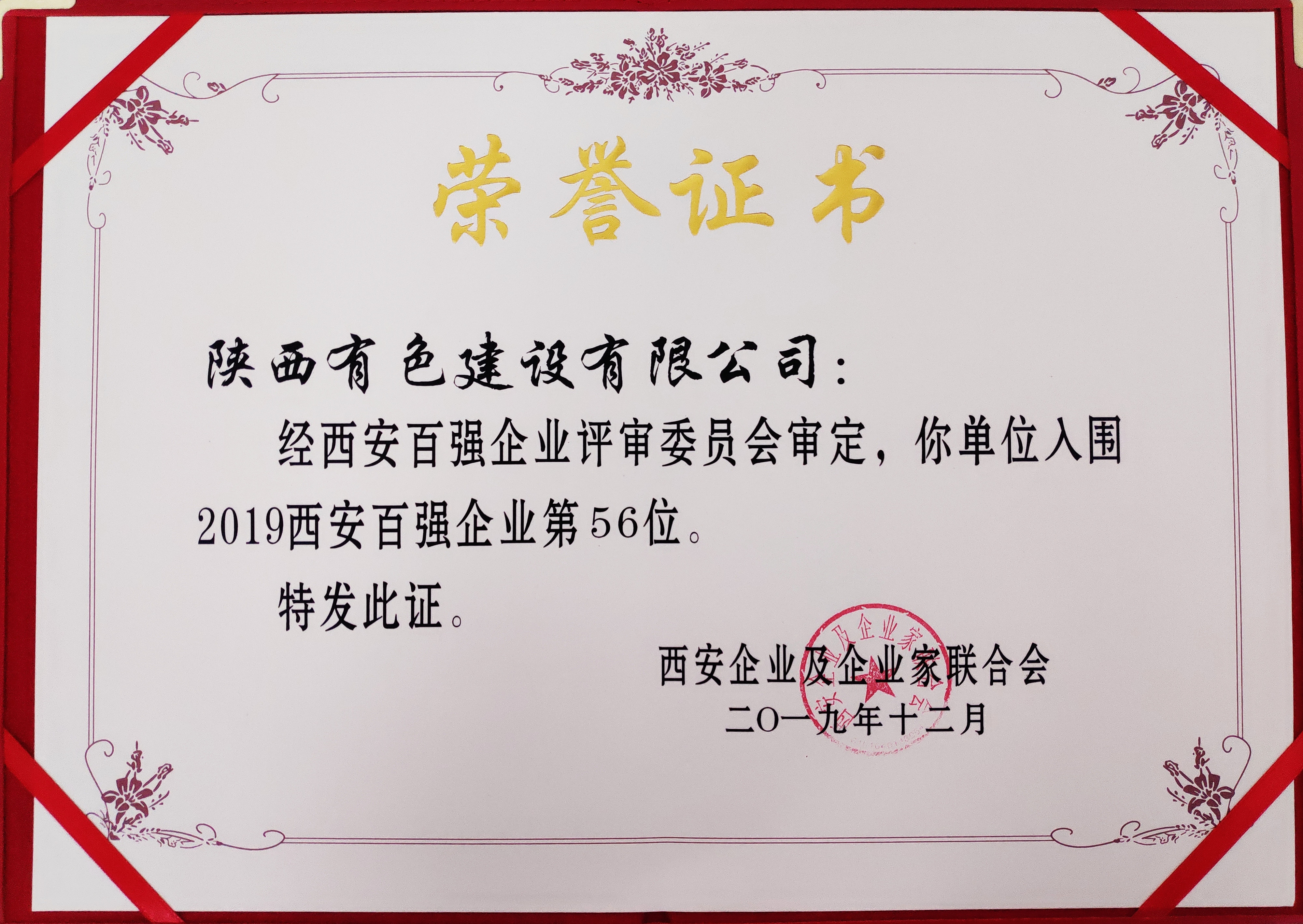 近日,《2019西安市百強企業》名單隆重揭曉,我公司憑借雄厚的實力和強勁的發展勢頭,榮登西安市企業百強榜單,位列第56位。這是公司繼獲得“西安市2019年建筑業高質量上規模發展企業”之后的又一項殊榮。